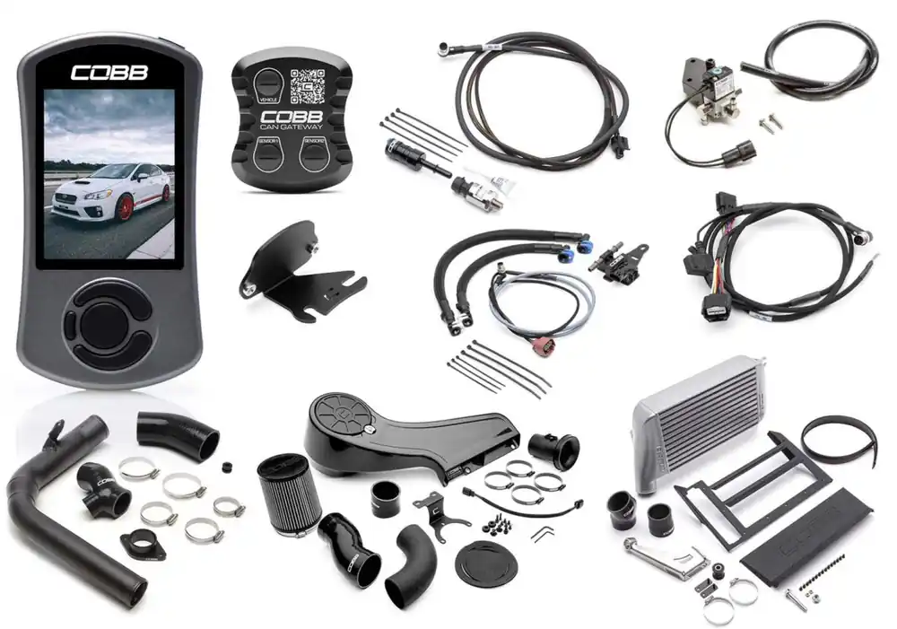 The Subaru NexGen Stage 2 + CAN Flex Fuel Power Package includes an Accessport V3, Redline Intake System, CAN Flex Fuel Upgrade (CAN Gateway Module with Harness / Bracket and Ethanol Sensor), CAN Fuel Pressure Sensor Kit, Charge Pipe Kit, Top Mount Intercooler Silver, 3-Port Boost Control Solenoid (BCS) & COBB Vehicle Badge for the Subaru WRX 6MT 2015-2017!