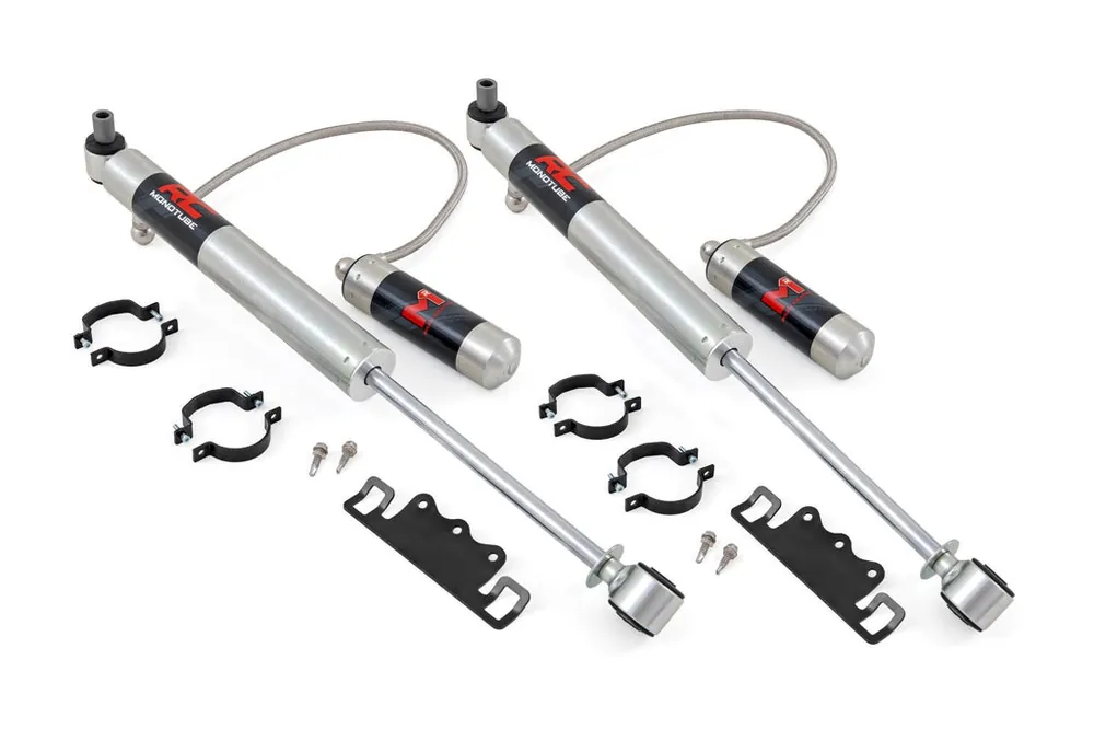 Unmatched Control. Maximum Performance: Rough Country’s M1R Monotube Shocks with External Reservoir deliver the perfect blend of control, comfort, and endurance. Designed to handle the harshest terrains and heaviest loads, the M1R ensures your ride performs at its peak, on or off the road.Built for Heat, Engineered for Pressure: Featuring an advanced 46mm monotube design and external reservoir, the M1R delivers faster heat dissipation and fade-free performance in any environment. An internal floating piston separates oil and gas for consistent damping, even during extreme use.Precision Performance and Comfort: With a 2-inch digressive piston and self-adjusting deflective-disc valving, the M1R adapts to changing terrains on the fly, giving you superior handling and ride quality. Whether cruising pavement or crawling trails, experience control without compromise.Unyielding Strength, Built to Last: From the 2-inch seamless extruded body to the 16mm case-hardened, chromed rod, every component is crafted for extreme durability. The galvanized zinc finish protects against corrosion, while natural rubber bushings minimize noise and vibration.Confidence You Can Count On: Backed by Rough Country’s 3-year manufacturer’s warranty, the M1R is built to go the distance, reliable, rugged, and ready for anything.