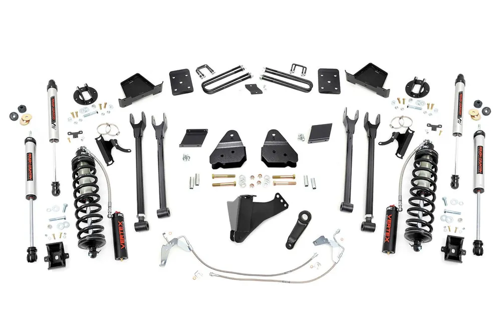 Superior Ride Quality. Give your third-generation Ford Super Duty an impressive upgrade and incredible ride quality with Rough CountryΓÇÖs 4-Link Coilover Conversion Lift Kit! This must-have kit is the pinnacle of suspension upgrades. Providing ride height adjustability, increased dampening, and killer good looks. You’re sure to set yourself apart from the pack. This innovative kit allows you to replace your factory arms with a 4-Link setup, using Rough CountryΓÇÖs durable, fixed upper arms and adjustable lower control arms. A set of radius arm drop brackets maintain proper geometry and allow for proper caster setting, which is crucial to maintaining factory handling.\\Durable Components. Rough CountryΓÇÖs 6″ 4-Link Coilover Conversion Lift Kit features top-mounted reservoir brackets and coil-over mounts constructed from 1/4-inch steel. Utilizing this conversion kit you’re removing the factory independent coil shock and coil set-up and replacing it with a massive 2.5in piston, nitrogen-charged, 8-stage adjustable Vertex Coilover. Rough CountryΓÇÖs Vertex Coilovers feature a monotube design with an external reservoir for increased oil capacity and damping sensitivity. When it comes to investing in a high-end kit, youΓÇÖll be pleased to find that Rough CountryΓÇÖs 2.5in piston design is beefier and offers an impressive 56% greater fluid capacity than the average reservoir shock. Each kit is paired with a monotube shock that provides optimal damping control.\\Installation. Requiring cutting and drilling to install, an estimated timeframe of 6-10 hours is recommended to complete this full installation. This full kit can be installed at home and can be completed efficiently and quickly!\\Limited Lifetime Replacement Warranty. Rough CountryΓÇÖs 4-Link Coilover Conversion Lift Kit is backed with a limited lifetime replacement warranty towards manufacturer defects. As such, the product is protected from structural and workmanship damage after the date of purchase. With our industry-leading warranty give yourself peace of mind when using Rough Country’s Suspension products!