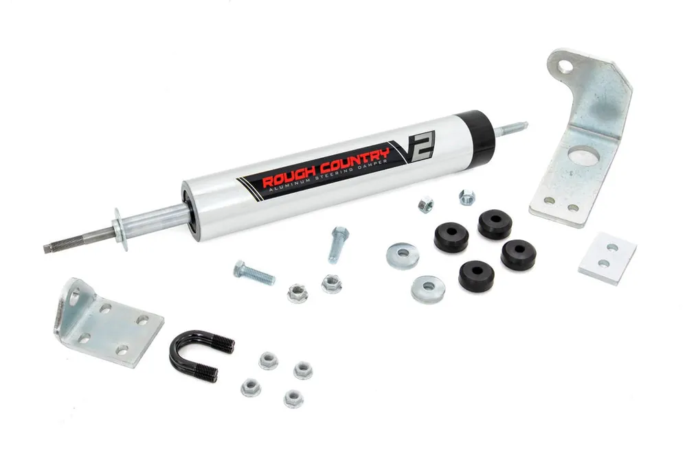 Superior Design and Comfort. Give yourself peace of mind when upgrading to a larger wheel and tire set up with Rough Country’s V2 stabilizers! Steering stabilizers are designed to restrain bump steer and front-end vibration, giving added life to tires, ball joints, and other steering components. Rough Country’s V2 stabilizers improve the overall driving experience providing precise dampening raising the vehicle’s overall comfort and functionality.