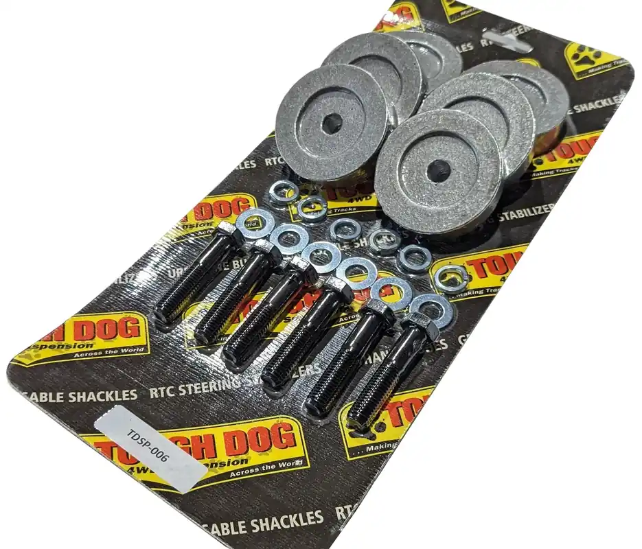 Designed to reduce tail shaft angle and remove driveline vibration that arises from an out-of-phase drivetrain. The universal joints in a vehicle’s tailshaft must operate at the same angle to operate harmoniously. If the angle of one universal joint is different to the other, or the universal joints are forced to operate on an angle larger that within tolerance, the resulting vibration can be felt through the vehicle when driven. To restore the universal joints to harmony, Tough Dog spacer kits are available for vehicles that commonly suffer from vibration.