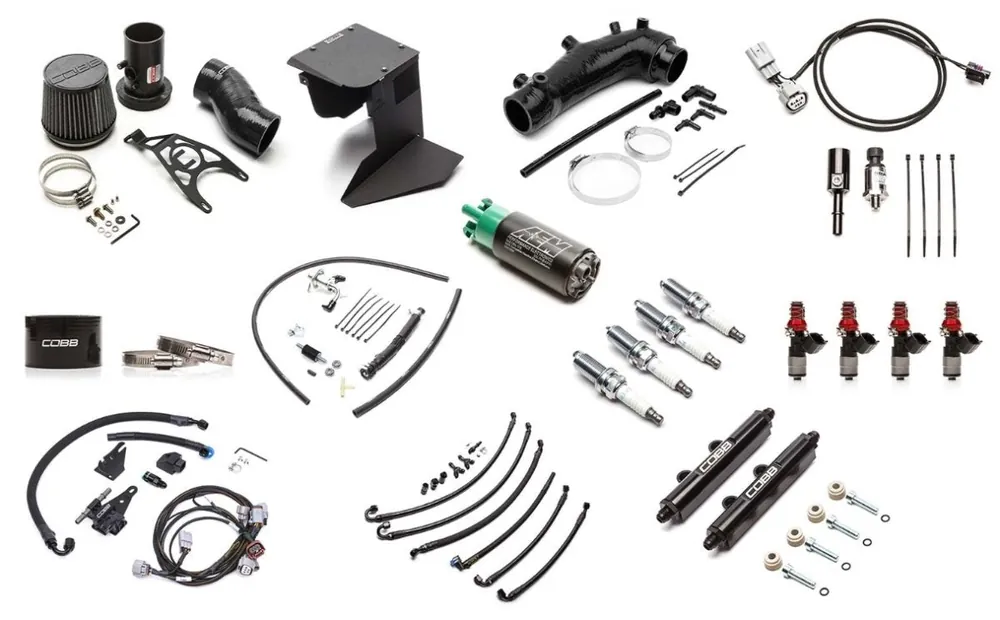 The Subaru Stage 1 to NexGen Stage 2+ Flex Fuel Power Package for STI Includes: SF Intake + Airbox, Silicone Turbo Inlet V2, Throttle Body Coupler, Spark Plugs, Top Feed 1050x Fuel Injectors, High Flow Fuel Pump, Fuel Pressure Regulator for Fuel Rail Kit, Fuel Rail Line Kit, Fuel Rails, NexGen Flex Fuel Ethanol Sensor Kit, Fuel Pressure Sensor Kit & the COBB Vehicle Badge.