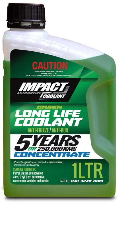 Impact Automotive Green Long Life Coolant is a unique blend of organic long life corrosion inhibitors and ethylene glycol designed to provide superior corrosion protectant and anti-freeze/anti-boil protection for many types of petrol, diesel and gas engines in light commercial and passenger vehicles, heavy duty commercial, industrial, on highway, marine, mining and stationary applications.