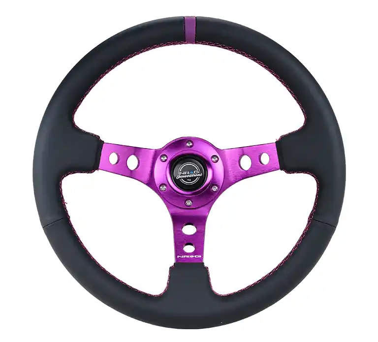 NRG Innovations 350MM Deep Dish Steering Wheel w/ Holes, Purple Center, Purple Stitching, Purple Stripe, and Black Leather Grip Exclusive Offer