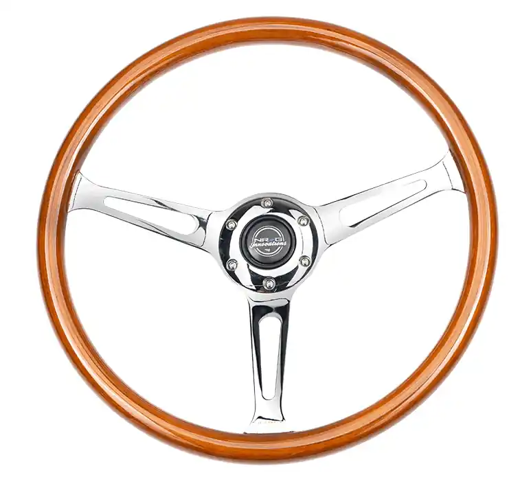 NRG Innovations 360MM Flat Steering Wheel w/ Slits, Chrome Center, and Woodgrain Grip Worldwide Shipping