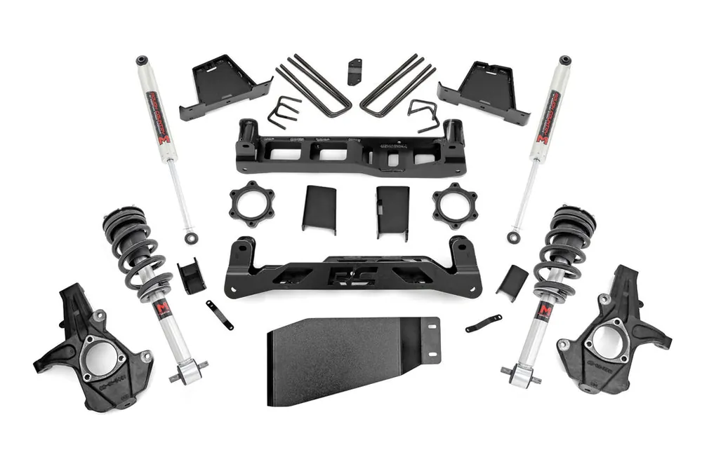 Go Big with Confidence: Rough Country’s 7.5-inch Suspension Lift Kit for your Chevy Silverado 1500/GMC Sierra 1500 delivers towering ride height, aggressive stance, and the clearance to run 35-inch tires all while using your factory 20-inch wheels. No wheel upgrades needed to dominate the trails.Clean, Level Stance from Front to Rear: Say goodbye to factory rake. This lift kit achieves a balanced, level profile that looks just as tough as it performs, giving your truck a commanding presence on and off the road.Engineered for Ground-Clearing Performance: Our signature high-clearance crossmembers feature a low-profile design with the iconic “RC” logo, giving you maximum ground clearance and trail-readiness. A heavy-duty lower skid plate and precision-engineered sway-bar and differential drop brackets further enhance durability and protection.Install Made Easy No Cutting Required: Designed with convenience in mind, this kit requires zero drivetrain, exhaust, or differential modifications. Even better, there’s no need to disassemble your struts making installation faster and smoother than traditional lift systems.Durability You Can Depend On: All components are precision laser-cut using advanced CAD technology, ensuring an exact fit and rock-solid durability. The included rear 6.5-inch heavy-duty fabricated lift blocks are stronger and more reliable than standard cast options and feature anti-wrap technology to preserve your factory ride quality.Customize Your Ride: This kit is fully compatible with your choice of Rough Country shock and strut options from our value-packed, nitrogen-charged N3s to the high-performance Vertex reservoir series. Get the ride feel and performance that matches your driving style.