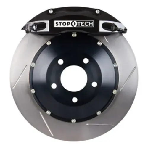 A StopTech Big Brake Kit represents the ultimate high performance brake upgrades and gives vehicles that supercar look and feel.StopTech Big Brake Kits exceed stock performance in two key areas: First, larger rotors increase heat capacity, allowing a driver to brake harder stop-after-stop with reduced chance of fade. Second, stiffer calipers and stainless steel lines reduce system compliance, providing consistent pedal feel and confidence-inspiring responsiveness.The key, however, is to increase heat capacity and reduce compliance without upsetting a vehicle’s stock front-to-rear brake torque ratio. That is why StopTech developed the Balanced Brake Upgrade design philosophy, which precisely apportions front and rear braking resources while factoring in vehicle weight transfer under braking. In contrast, a brake upgrade that adds too much front torque (as many do), will reduce your car’s ability to maximize the traction available from all four tires, robbing you of performance. In addition, a system that uses too many pistons or pistons that are too large will make the brake pedal much more difficult to modulate, limiting a driver’s control of brake input.*The Stiffest, Fully Forged 2-piece, Opposed Piston Calipers*StopTech 2-piece calipers have the lowest amount of flex and deflection among 25 of the leading caliper models (including some monoblocks) from well-known manufacturers. This is accomplished using StopTech’s patented bolt-in bridge, which is strong enough to stop distortion without sacrificing cooling through the top of the caliper.The standard StopTech caliper finish is a glossy high temperature paint available in one of six different colors – red, black, silver, blue, yellow and gold.Trophy Sport and Trophy Race Big Brake Kits use weight-optimized STR calipers finished with a deep natural anodized coating that resists fading and discoloration at extreme temperatures. * Less vibration * Less Noise * Better pedal feel under extreme braking conditions * Faster braking response * Less pad taper*Patented AeroRotors and AeroHats that offer up to 80% greater airflow*StopTech has developed several design innovations to improve rotor airflow. The patented 2-piece AeroRotors push more air thanks to curved, airfoil-shaped vanes and an air channel that widens at the trailing edge of the vanes. StopTech aluminum AeroHatsare lighter, and feature directional stand-offs between the rotor and mounting hat that increase airflow to the (hotter) outside face of the rotor by over 15%. * Specifically engineered and patented AeroVanes for optimum cooling * Optimized to provide even performance and consistent feedback * Longer pad and rotor life*Hard Anodized 6061-T6 Billet aluminum Mounting Brackets with Stainless Steel Studs*Application-specific hardware that is stronger than most competitors, with studs instead of the more commonly used bolts and hard anodized aluminum billet composition. * Hard anodized billet aluminum mounting brackets * Stainless steel studs secured with set screws for strength and durability * Fully machined aluminum or steel that is precise and strong * Application specific design for precise and proper fitment * All necessary hardware for easy installation*StopTech Stainless Steel Brake Line Kits*Braided stainless steel lines reduce system compliance and improve brake pedal feel and modulation. StopTech’s Stainless Steel Brake Lines are D.O.T. compliant and designed to fit your vehicle. * Stainless steel braiding for lower compliance and extra protection * Provides quicker response * Firmer pedal feel * A variety of fittings for hundreds of applications * All necessary brackets and fasteners for easy installation * Better brake modulation * D.O.T. compliant*StopTech Street Performance Brake Pads*StopTech Street Performance Brake Pads are included in all Big Brake Kits besides the track-only Trophy Race Big Brake Kits.StopTech Street Performance Pads are intended for high performance street driving as well as light duty track use. * Aggressive pad for high performance street driving * Para-aramid composites provide linear response regardless of pad temperature * 100% positive molded for uniform friction material density * Low dust formulation is rotor friendly and leaves wheels cleaner * Scorched to raise initial cold effectiveness and ease bed-in * 100% Asbestos-free formulas