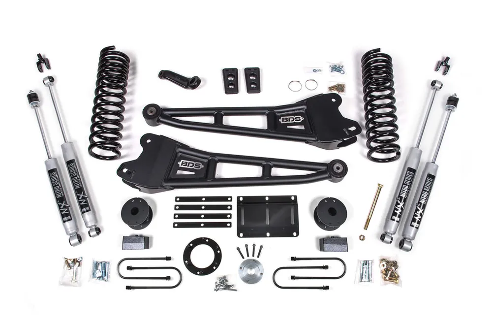 Take your 2013-2018 RAM 3500 diesel powered truck to the next level with this 6-inch radius arm lift kit from BDS Suspension. Engineered for trucks factory equipped with rear air ride. Designed to improve stance, performance, and capability, this kit includes everything necessary to set your truck up right with clearance for up to 37″ tires.