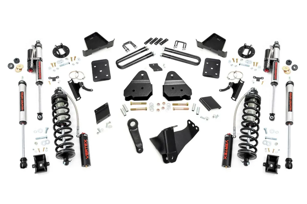 Explore New Heights. Give your third-generation Ford Super Duty superior lift height with Rough Country’s 4.5-inch Coilover Suspension Lift Kit! This all-inclusive kit comes with everything you need for a total transformation of your truck. Run up to 35in tires while preserving the smooth, factory ride quality with this impressive upgrade.\\Durable Components. When changing a vehicle’s suspension, the key to preserving ride quality is keeping the geometry of all suspension components as close to their factory angles as possible. Rough Country’s new 4.5-inch Suspension Lift features a set of ultra-durable radius arm drop brackets, precision fit to bolt right into the factory mounts for an easier install and a more factory-like angle. Utilizing this conversion kit you’re removing the factory independent coil shock and coil set-up and replacing it with a massive 2.5in piston, nitrogen-charged, 8-stage adjustable Vertex Coilover. Rough CountryΓÇÖs Vertex Coilovers feature a monotube design with an external reservoir for increased oil capacity and damping sensitivity. When it comes to investing in a high-end kit, youΓÇÖll be pleased to find that Rough CountryΓÇÖs 2.5in piston design is beefier and offers an impressive 56% greater fluid capacity than the average reservoir shock. Each kit is paired with a monotube shock that provides optimal damping control.\\Installation. Requiring cutting and drilling to install, an estimated timeframe of 6-10 hours is recommended to complete this full installation. This full kit can be installed at home and can be completed efficiently and quickly!\\Limited Lifetime Replacement Warranty. Rough Country’s 4.5-inch Coilover Suspension Lift Kit is backed with a limited lifetime replacement warranty towards manufacturer defects. As such, the product is protected from structural and workmanship damage after the date of purchase. With our industry-leading warranty give yourself peace of mind when using Rough Country’s Suspension products!