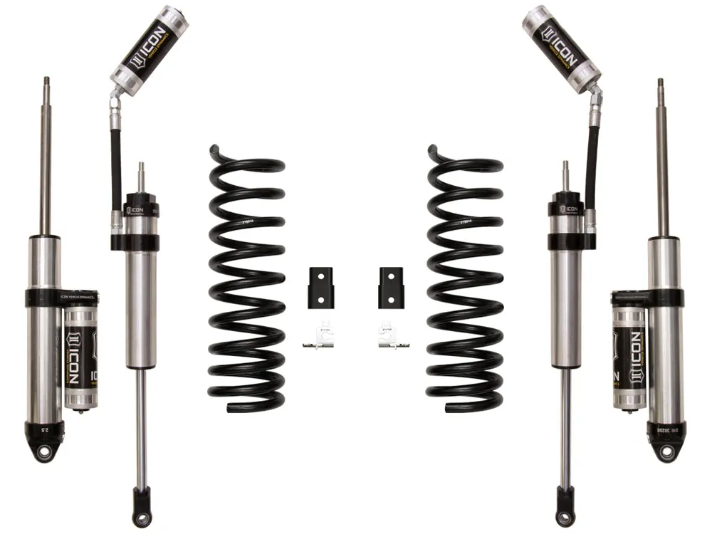 ICON’s 2014-UP RAM 2500 4WD 2.5” Stage 2 Suspension System is made up of dual rate front coil springs, necessary bracketry and hardware, as well as 2.5 Aluminum Series reservoir front and rear shocks. This system improves ride quality and performance both on and off road. The ICON stage 2 system is great for towing, rough construction site terrains, and country dirt roads all while keeping a smooth highway feel. ICON 2.5 Aluminum Series reservoir shocks ensure optimum performance by increasing the duration of consistent damping regardless of situation, keeping the shocks at a cooler operating temperature during heavy use. With the endless hours ICON has spent testing and tuning our suspension components and shocks as a complete package, you can rest assured you have the best suspension solution on the market.