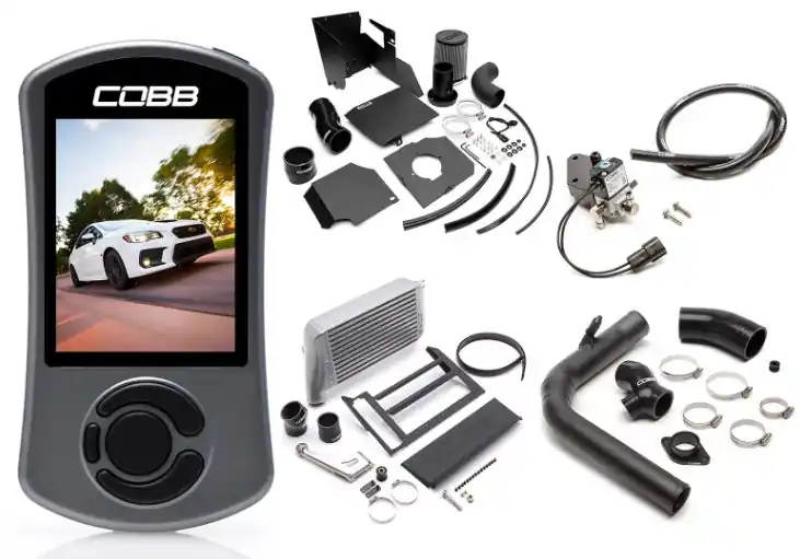 The Subaru NexGen Stage 2 Power Package WRX 2015-2021 includes an Accessport V3, SF Intake System, Charge Pipe Kit, Top Mount Intercooler Black, 3-Port Boost Control Solenoid (BCS) & COBB Vehicle Badge!