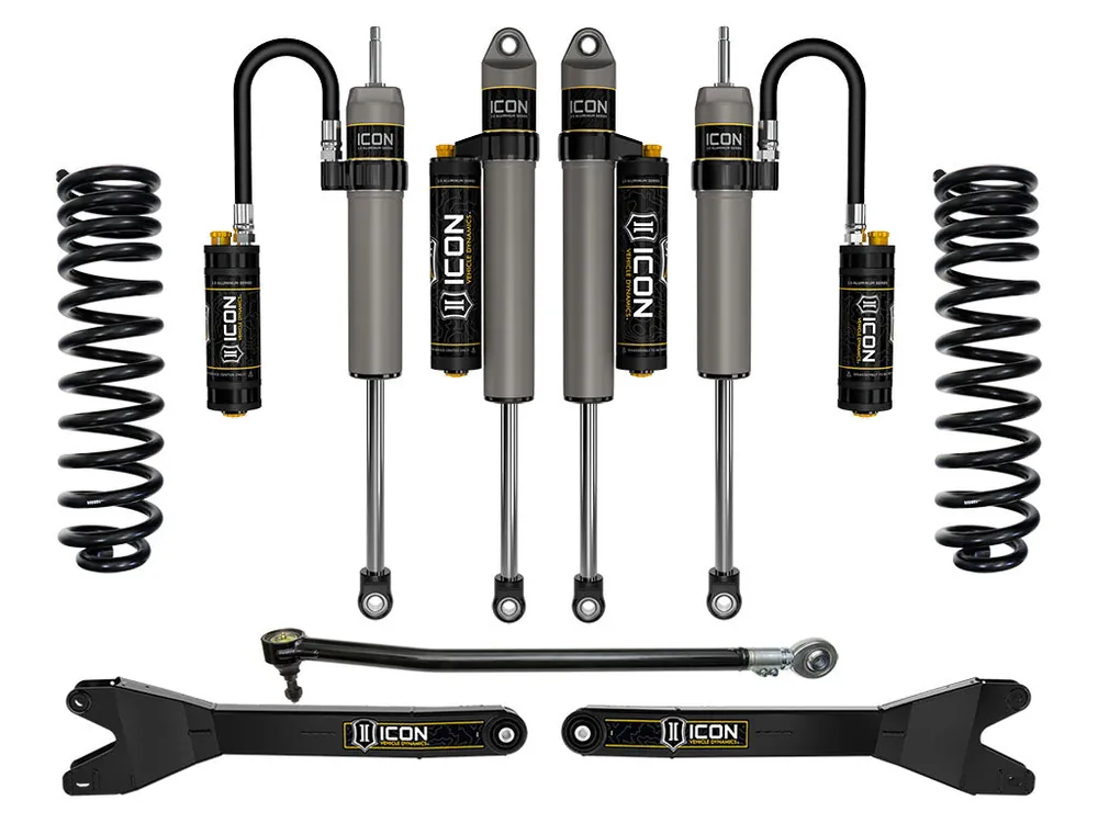 This ICON Vehicle Dynamics 2.5” suspension system is a great way to lift your 4WD 2023 Ford F-250/F-350 Super Duty while drastically improving ride quality and performance. The Stage 4 system is perfect for on-road and off-road use including towing, job site duty and general off-road adventure. Also included in this stage is ICON’s CDC Valve front and rear shocks, for those desiring an easy way to tune the ride externally with 10 settings, from soft to hard. ICON’s Stage 4 System is comprised of dual rate coil springs optimized for trucks equipped with gasoline engines, fabricated Radius arms, on-vehicle adjustable front track bar, and ICON 2.5 Aluminum Series CDCV remote reservoir front and CDCV piggyback reservoir rear shocks. This stage sees the inclusion of the ICON Vehicle Dynamics Ford Super Duty Radius Arm System that feature a sealed pivot bushing that minimizes road feedback and ensures a long life and quiet operation. Additionally, their fabricated, fully boxed design ensures strength and utilizes a profile optimized for tire clearance at full steering lock, making a 37” tall tire clear without coming in contact with the radius arm. With the endless hours ICON has spent testing and tuning our suspension components and shocks as a complete package, you can rest assured you have the best suspension solution on the market.