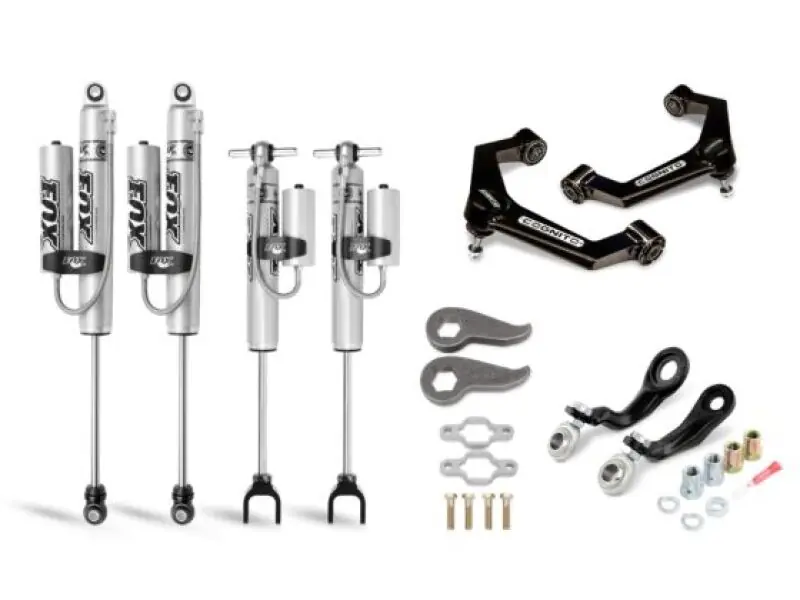 We have bundled everything you need in a leveling kit for your Silverado/Sierra 2500/3500 2WD/4WD with high quality Cognito components and Fox shocks.There is no guesswork. Cognito components are engineered, manufactured and assembled in the USA. This kit includes the Cognito Ball Joint SM Series Upper Control Arm Kit, Torsion Bar Adjuster Keys, Cognito Pitman and Idler Arm Support Kit, front and rear Fox Performance Series Remote Reservoir shocks and front shock spacers to maximize droop travel.The Cognito Ball Joint SM Series Upper Control Arms add style, function, and performance to your vehicle by improving the allowable droop travel for a better ride quality. The control arm kit features boxed sheet metal arms that are welded and powder coated semi-gloss black.The Cognito PISK (Pitman and Idler Arm Support Kit) replaces the problem components that plague factory and aftermarket steering systems on several models and years of GM trucks and SUVs.These improvements are accomplished through application of Cognito’s innovative, patented design, by providing additional support to the vehicle’s pitman and idler arms, which eliminate the forward and rearward movement of the center-link.Fox 2.0 Performance Series Remote Reservoir smooth body shock delivers FOX’s industry leading and race dominating performance in an affordable, hassle-free bolt on package. Its external reservoir allows for increase oil and nitrogen capacity while delivering striking race look.The race developed high flow damping piston matched with application specific valving provides the 2.0 Performance Series Reservoir shock a predictable ride quality capable of handling the roughest road conditions.