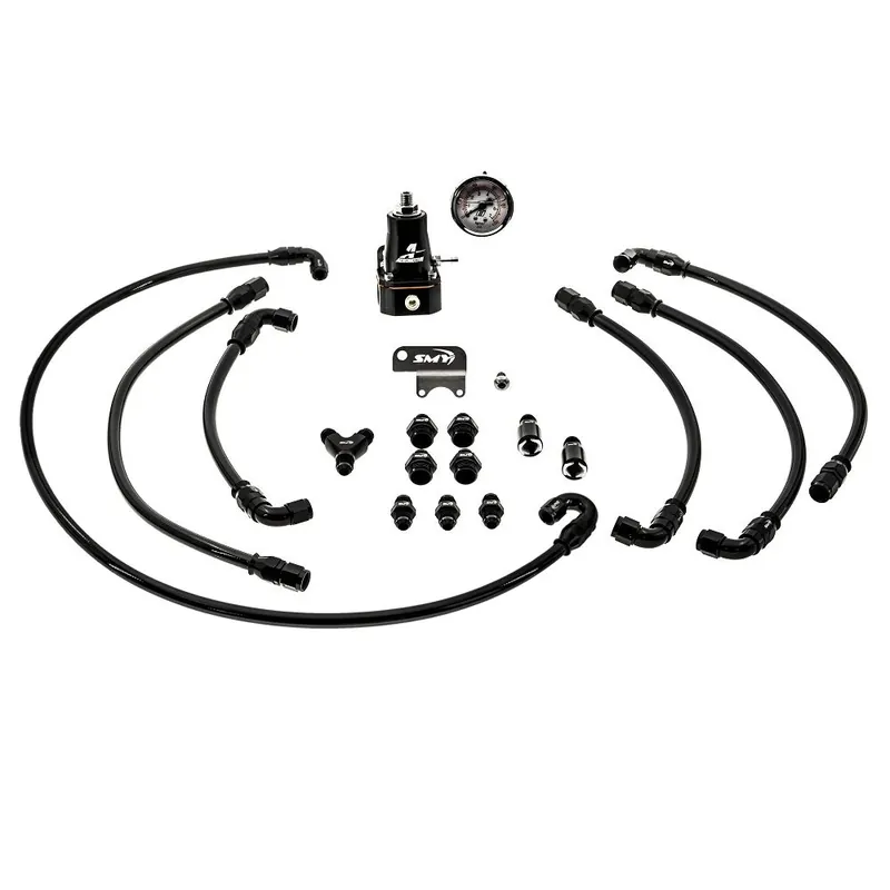 The SMY fuel line kit shown here is perfect for anyone looking to upgrade their OEM fueling setup. This kit will support up to 1000 hp. Our fuel lines are not the simple cheap rubber hoses with a nice jacket as supplied on many other kits. OurPTFE fuel lines are reinforced with braided stainless steel, then to make it pretty they are wrapped in a gloss black PVC Coated jacket. We also include all high-end AN fittings, even to the hard lines. This kit will remove the OEM fuel pressure regulators and replace them with an aftermarket fuel pressure regulator.