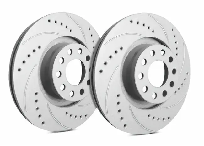 SP Performance drilled and slotted rotors gives the advantages of both drilled holes for cooling and slots to expel gasses and brake dust. SP Performance Rotors use only the finest materials from very select factories. SP Performance Cross Drilled and Slotted Rotors are at the top of the list for performance rotors. By eliminating the sharp edges on our Cross Drilled holes, it greatly reduces the chance of cracking by moving the air and brake dust from the disc brake surface while reducing the surface temperature. By keeping the surface temperature down, this nearly eliminates heat checking and warping. All SP Performance Rotors are manufactured to OEM specifications, machine balanced and gray ZRC Coating.