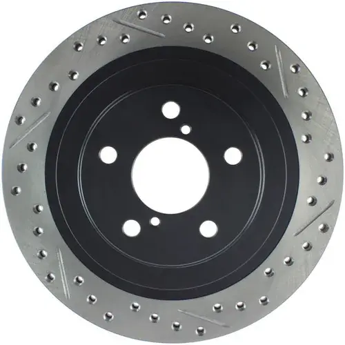 StopTech recognizes that great brakes need to look as good as they perform. Performance wheels and tires are best complemented with StopTech SportStop Cross-Drilled & Slotted rotors.SportStop Drilled & Slotted brake rotors prevent glazing of the pads, add bite and improve wet and dry braking performance.Every SportStop Drilled & Slotted brake rotor is produced from a high quality Centric Parts blank casting and finished in a durable e-coating for corrosion resistance.SportStop Drilled & Slotted rotors look great behind custom wheels, improve the initial bite of the brake pads, and help wipe away the debris that forms between the pad and the disc. A set of SportStop cross-Drilled & Slotted rear replacement rotors is a great way to match the aesthetics of a StopTech Big Brake Kit with the cross-Drilled & Slotted rotor option. *E-Coated Finish*Every SportStop rotor is finished with black e-coating on both sides of the hat, inside the the cooling vanes, and on the outside edge. E-coating is a superior electro-statically applied finish designed to withstand 400 hours of salt water exposure without rusting. This is especially important on both mounting faces of the hat where it touches the hub flange and back face of the wheel. Any accumulation of rust in these area can lead to installed lateral run out issues.*Power Alloy Metallurgy*Power Alloy metallurgy is exclusive feature of SportStop rotors. In specific vehicle applications, StopTech works with foundry partners to increase the molybdenum or carbon content of the castings, and to carefully control the cooling rate during production to reach targets for hardness and tensile strength.*Cooling Vane Design*Nearly all SportStop Cross-Drilled & Slotted rotors have unique Drilled & Slotted hole patterns for the left and right sides of the vehicle. For these directional patterns, straight vane or pillar vane rotors are used to ensure that a Drilled & Slotted hole never touches a cooling vane.