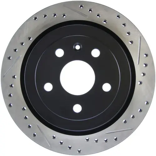 StopTech recognizes that great brakes need to look as good as they perform. Performance wheels and tires are best complemented with StopTech SportStop Cross-Drilled & Slotted rotors.SportStop Drilled & Slotted brake rotors prevent glazing of the pads, add bite and improve wet and dry braking performance.Every SportStop Drilled & Slotted brake rotor is produced from a high quality Centric Parts blank casting and finished in a durable e-coating for corrosion resistance.SportStop Drilled & Slotted rotors look great behind custom wheels, improve the initial bite of the brake pads, and help wipe away the debris that forms between the pad and the disc. A set of SportStop cross-Drilled & Slotted rear replacement rotors is a great way to match the aesthetics of a StopTech Big Brake Kit with the cross-Drilled & Slotted rotor option. *E-Coated Finish*Every SportStop rotor is finished with black e-coating on both sides of the hat, inside the the cooling vanes, and on the outside edge. E-coating is a superior electro-statically applied finish designed to withstand 400 hours of salt water exposure without rusting. This is especially important on both mounting faces of the hat where it touches the hub flange and back face of the wheel. Any accumulation of rust in these area can lead to installed lateral run out issues.*Power Alloy Metallurgy*Power Alloy metallurgy is exclusive feature of SportStop rotors. In specific vehicle applications, StopTech works with foundry partners to increase the molybdenum or carbon content of the castings, and to carefully control the cooling rate during production to reach targets for hardness and tensile strength.*Cooling Vane Design*Nearly all SportStop Cross-Drilled & Slotted rotors have unique Drilled & Slotted hole patterns for the left and right sides of the vehicle. For these directional patterns, straight vane or pillar vane rotors are used to ensure that a Drilled & Slotted hole never touches a cooling vane.