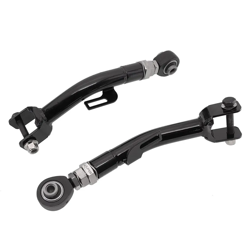 Crafted from stainless steel with heavy-duty pillow ball mounts, these rear trailing arms offer +/- 12mm rod-end length adjustability for precise rear caster tuning. They bolt on as direct OE replacements (OEM Part #20250FL001) and come painted gloss black for lasting corrosion resistance. Included are a pair of trailing arms, bolts, and nylon insert nuts with torque specs for straightforward installation.