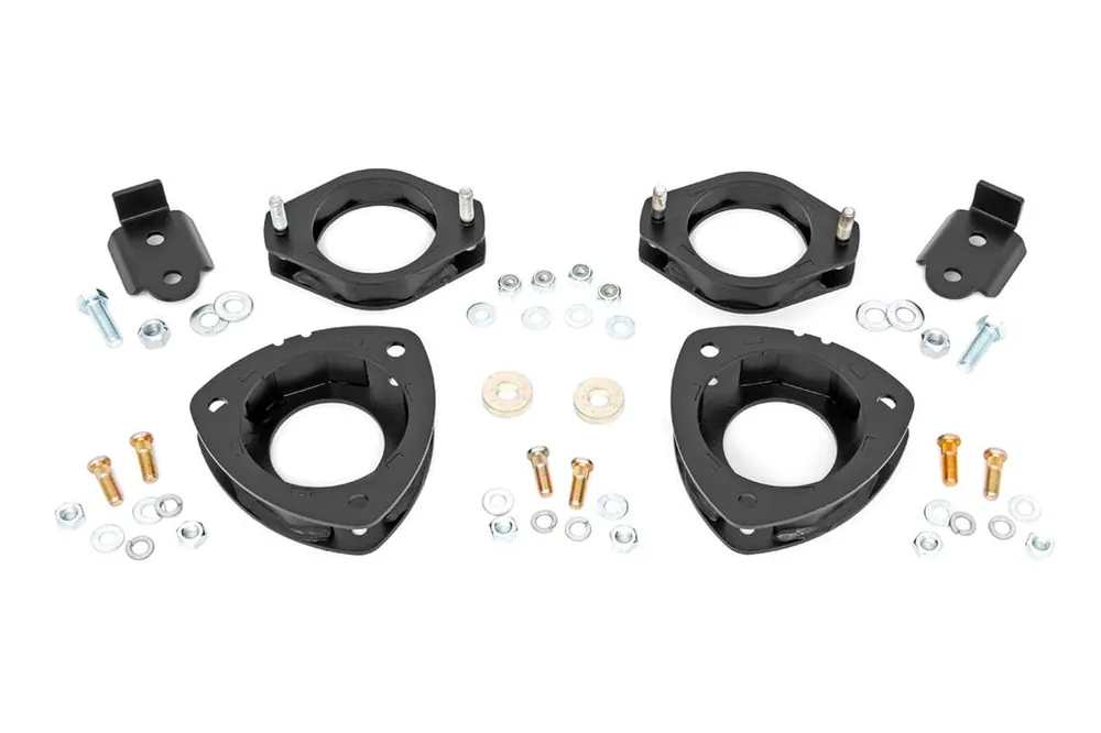 Each kit features a set of front and rear strut spacers, laser cut for a precise fit, and powder coated black to resist the elements. Rough Country’s 2in Leveling Kit features an easy installation process with no need for complicated strut disassembly. Includes a Lifetime Replacement Guarantee!