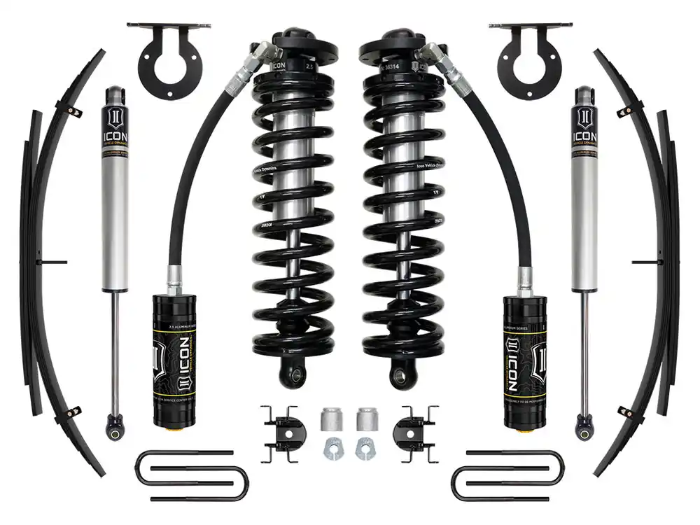 The ICON coilover conversion suspension system is a great way to lift your 4WD 2017-2023 Ford F-250/F-350 Super Duty while improving ride quality and performance. This entry level system is great for towing, rough construction site terrains, and country dirt roads all while keeping a smooth highway feel. ICON’s Stage 1 System is comprised of 2.5 Series remote reservoir coilovers that are adjustable from 2.5-3” or 3.25-3.75 of front lift over stock (depending on year model and option package), alignment cams for adding caster, rear leaf spring expansion packs with blocks and U-bolts for a more compliant ride and reduced axle wrap, and ICON 2.0 Aluminum Series internal reservoir rear shocks. With the endless hours ICON has spent testing and tuning our suspension components and shocks as a complete package, you can rest assured you have the best suspension solution on the market.
